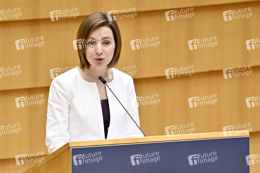 Maia Sandu bei einer Rede zum EU-Assoziierungsabkommen mit der Republik Moldau im Plenarsaal des Europäischen Parlaments. Brüssel, 18.05.2022