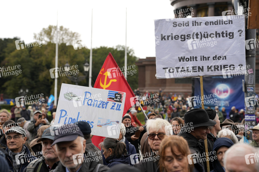 Friedensdemonstration unter dem Motto 'Nein zu Krieg und Hochrüstung! Ja zu Frieden und internationaler Solidarität' vor der Siedessäule am Großen Stern. Berlin, 03.10.2024