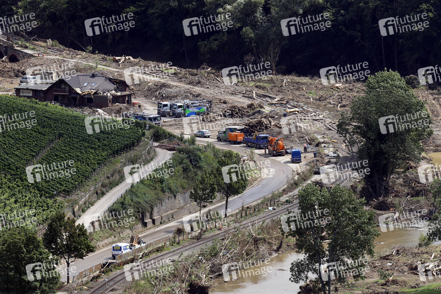 Nach dem Jahrhunderthochwasser in der Eifel durch heftige Regenfälle und Dauerregen mit Überschwemmungen und Überflutungen haben die Aufräumarbeiten im Ahrtal große Fortschritte gemacht. Einheiten von Polizei, THW, Bundeswehr und Feuerwehr mitsamt vielen freiwilligen Helfern haben Straßen geräumt, Schutt und Schlamm entfernt und die Menschen versorgt. Der Wiederaufbau wird trotzdem Jahre dauern. Im Bild Flutschäden in der Ortschaft Dernau, in der die Flut viele Häuser zerstörte, 08.08.2021