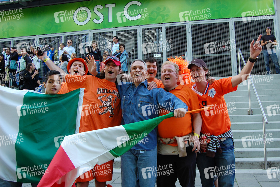 Fußball-Europameisterschaft 2008 / UEFA EURO 2008 in Österreich und der Schweiz. Italienische und Holländische EM Fans warten am Stade de Suisse in Bern auf ihre Teams zum Abschlußtraining, bevor das große Spiel Niederlande gegen Italien startet