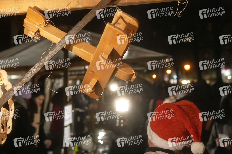 Ein Holzflugzeug auf dem Alt-Rixdorfer Weihnachtsmarkt rund um den Neuköllner Richardplatz. Berlin, 08.12.2024