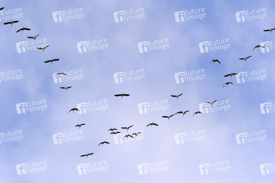 Vögel, Zugvögel, Vogelschwarm, Schwarm, Winter, Überwintern, Kraniche, Kranich, Ende des Sommers, Winterzeit, Winteranfang, innere Uhr, innerer Kompass, Zugverhalten, Ornithologie, Zugvogel, Instinkt, Schwarmintelligenz, Flugstrecke, Flugroute, Winterquartier, Vogelbeobachtung, Erdmagnetfeld, Symbolbild, Symbolfoto
