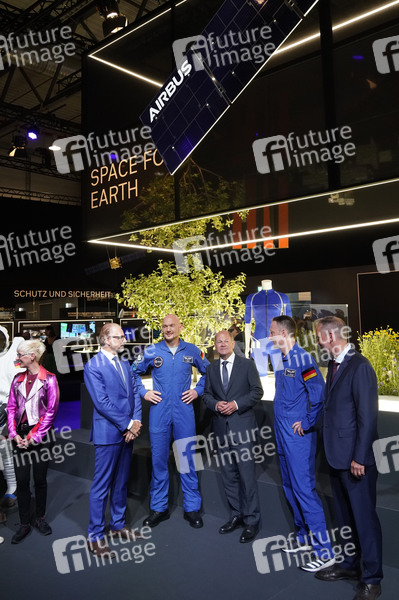 Josef Aschbacher, Alexander Gerst, Olaf Scholz, Matthias Maurer und Michael Schöllhorn bei der ILA-Eröffnung mit anschließendem Rundgang auf dem ILA-Gelände am Flughafen BER Berlin-Brandenburg. Berlin, 22.06.2022
