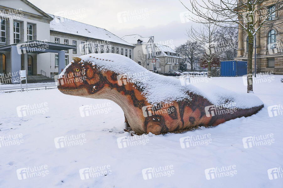 Verschneiter Dinosaurier am Landesmuseum zur Sonderausstellung 'Kinoaaurier. Zwischen Fantasie und Forschung'. Hannover, 30.01.2021