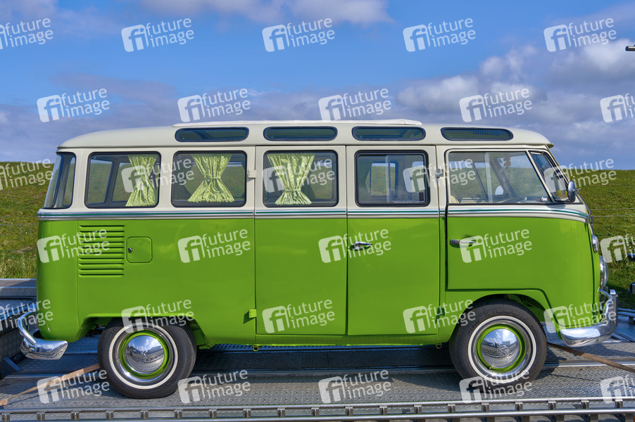 VW Bulli bei Dreharbeiten zur ZDF-Fernsehserie 'Dr. Nice' am Leuchtturm Falshöft. Pommerby, 11.09.2025