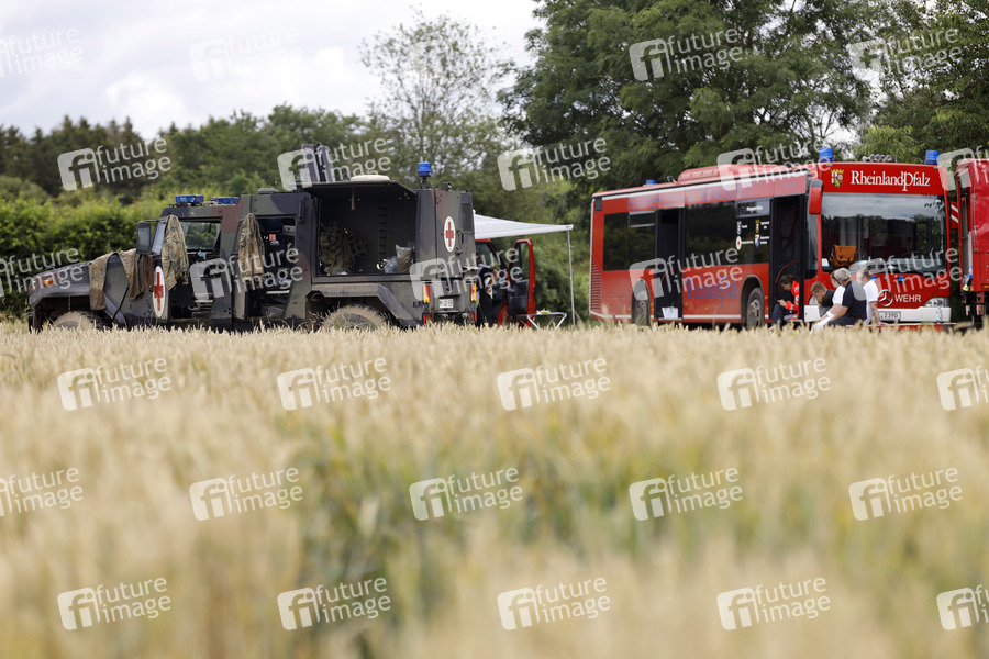 In der Eifel haben heftige Regenfälle und Dauerregen für Überschwemmungen und Überflutungen gesorgt. Im Ahrtal trat der Fluss vielerorts über die Ufer und überschwemmte nicht nur Keller sondern ganze Ortschaften. Im Bild das Camp der Rettungskräfte in den Bergen über dem Ort Dernau (Landkreis Ahrweiler), der beinahe komplett von den Wassermassen geflutet wurde. Viele Menschen verloren alles. Dernau, 15.07.2021