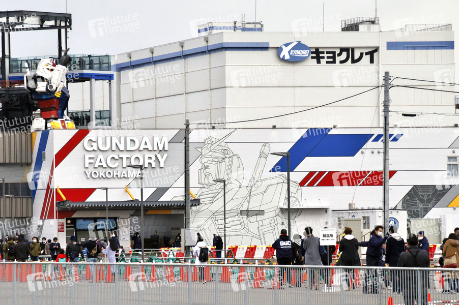 Der 19 Meter großer Modell-Roboter RX-78-2 Gundam aus der Animationsserie 'Kido Senshi Gundam / Mobile Suit Gundam' bei der Eröffnung der Gundam Factory Yokohama am Yamashita Pier. Der Roboter im Originalmaßstab kann insgesamt 24 Gelenke bewegen. Jede halbe Stunde nimmt er eine andere Pose ein und abends wird er beleuchtet. Yokohama, 19.12.2020