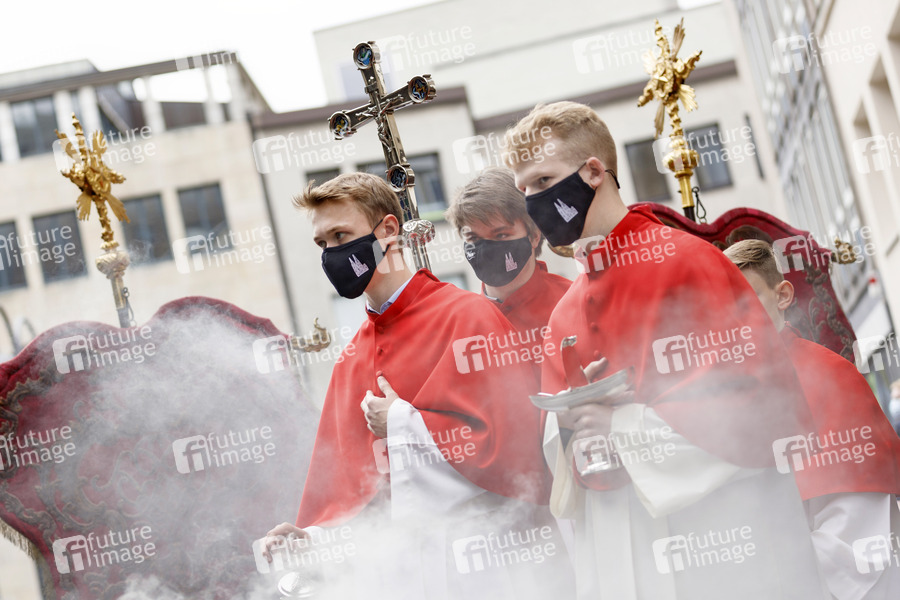 Religion, Glaube, Prozession, Messe, Gott, Gottesfurcht, Katholizismus, katholisch, Christen, Christentum, Kölner Dom, Prozession, Fronleichnam, Fronleichnamsprozession, Umzug, Weihrauch, Erzbistum Köln, Erzbischof, Hochfest, Gottesdienst, Messe, Pontifikalamt, katholische Kirche, bleibende Gegenwart Jesu Christi im Sakrament der Eucharistie, Fronleichnamsgottesdienst, Maskenpflicht, Kirche, Kirche in Zeiten von Corona, Jesus, Christus, Coronavirus, Coronakrise