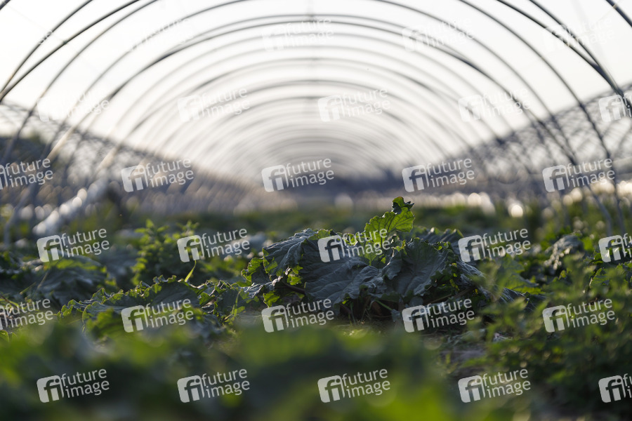 Rhabarber, Rheum rhabarbarum, Plantage, Ackerbau, Landwirtschaft, Gemüse, Folientunnel, Foliendach, Rhabarberplantage, Gewächshaus, Anbau, Acker, Ernte, Rhabarberstangen, Bauernhof, Knöterich, Knöterichgewächse, Bewirtschaftung, Photosynthese, Fotosynthese, Kultivierung, Pflanzung, Pfllanzenaufzucht, Selbstversorger, Standort, Bewässerung, Garten, Nutzgarten, Gartenbau, Symbolbild, Symbolfoto