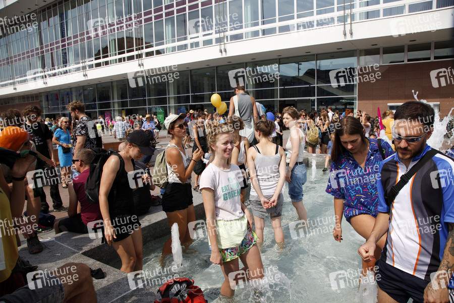 Demonstranten verschiedener Gruppen protestieren unter dem Motto 'Unteilbar: Für eine offene und freie Gesellschaft - Solidarität statt Ausgrenzung' gegen Rassismus, für soziale Gerechtigkeit und gegen Ausgrenzung am Altmarkt. Dresden, 24.08.2019