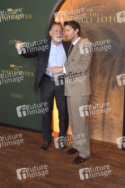 Arnold Schwarzenegger, mit Sohn Patrick Schwarzenegger bei der Premiere der 3. Staffel der HBO Serie 'The White Lotus' im Paramount Theater. Los Angeles, 10.02.2025