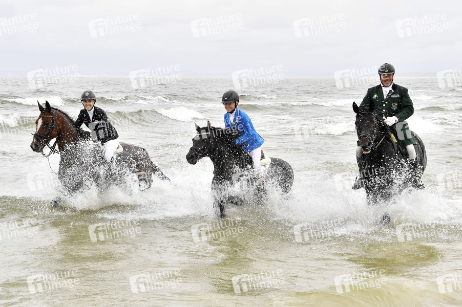 Janne Friederike Meyer-Zimmermann, Rhea Harder-Vennewald und Till Demtröder beim Defilée der Reiter und Hunde von Heringsdorf entlang des Strandes zur Seebrücke Ahlbeck. Usedom, 08.09.2019