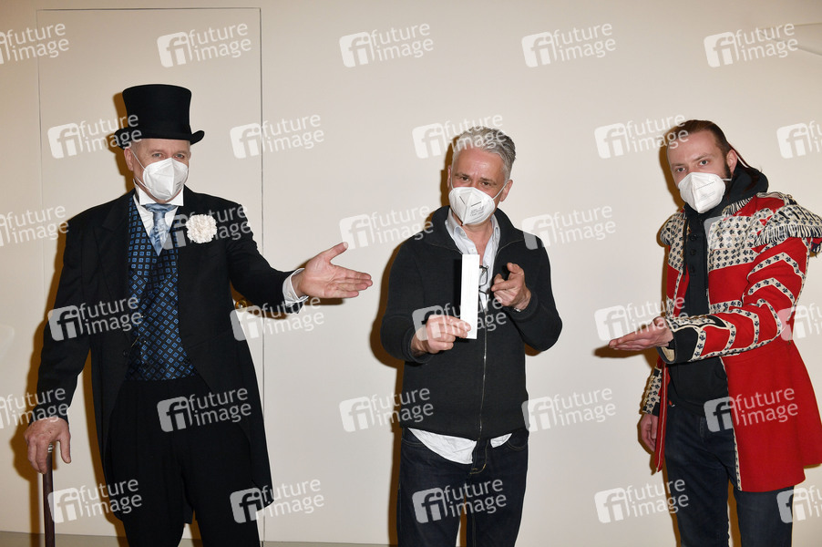 Peer Martiny, Martin Woelffer und Robert Kowarik beim Fototermin mit dem (getesteten) Ensemble des Theaterstücks 'Vorhang auf für Cyrano' in Maske und Kostüm vor dem Testzentrum im Schiller Theater. Unter dem Motto 'Testen statt spielen' eröffnen die Komödie am Kurfürstendamm und der KitKatclub ein gemeinsames Testzentrum im Schiller Theater. Berlin, 07.04.2021