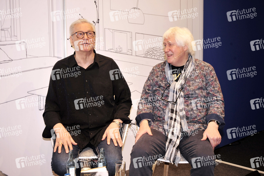 Gerd Christian und Wolfgang Martin beim Talk zum Buch 'Sagte mal ein Dichter. Holger Biege. Die Biografie' auf der Leipziger Buchmesse 2019 in der LVZ-Autorenarena. Leipzig, 23.03.2019