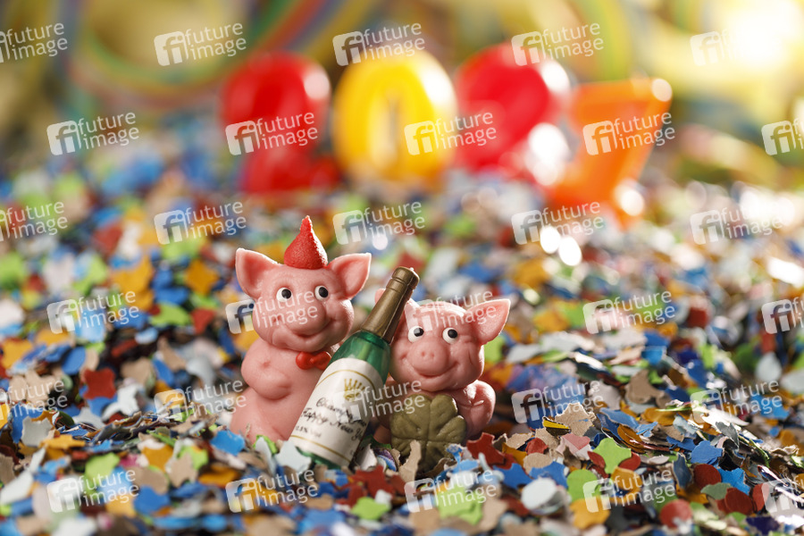 Marzipan, Schwein, Schweine, Schwein gehabt, Marzipanschwein, Marzipanschweinchen, Schweinchen, Glücksschwein, Glück, Konfetti, Glücksklee, Glückssymbol, Kleeblatt, Luftschlangen, Sektkorken, 2020, 2021, Feiertage, Fest, Glück, Silvester, Neujahr, Frohes Neues Neujahr, gute Vorsätze, Jahreswechsel, Kultur, Festkultur, zwischen den Tagen, zwischen den Jahren, Altjahrswoche, Jahresausklang, Jahresende, Sektkorken, Jahreswende, Feiern, Party, Coronajahr, Corona-Jahr, Champagner, Champagnerflasche, Schampus, Sekt, Alkohol, Symbolbild, Symbolfoto