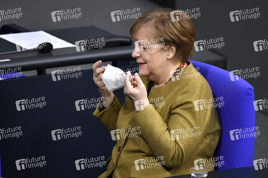 Angela Merkel in der 215. Sitzung des Deutschen Bundestages im Reichstagsgebäude. Berlin, 04.03.2021