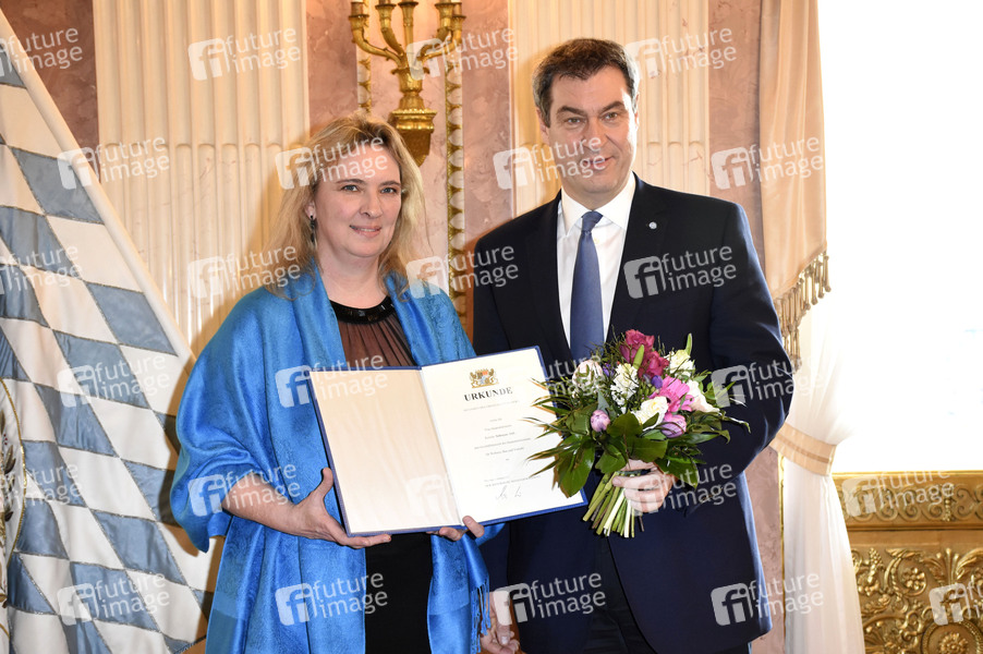 Kerstin Schreyer (Staatsministerin für Wohnen, Bau und Verkehr) und Markus Söder bei der Aushändigung der Ernennungsurkunden an die neuen Kabinettsmitglieder im Prinz-Carl-Palais. München, 06.02.2020