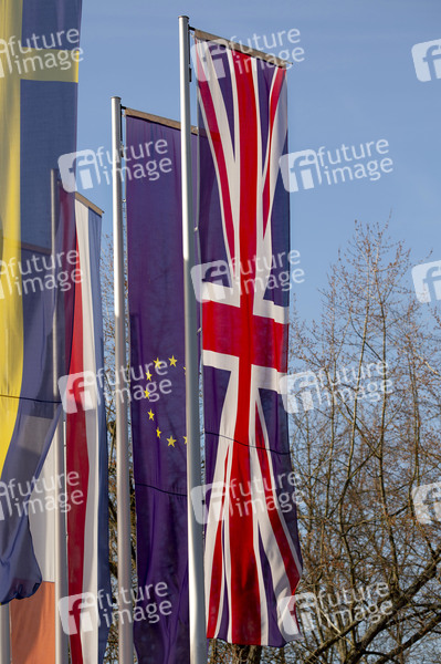 Flaggen Europa und Vereinigtes Königreich am Europa Park. Rust, 20.02.2020