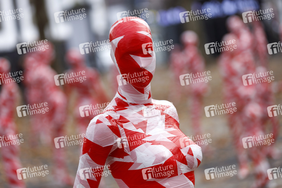 Kunst-Installation 'It is like it is - Mahnmal zur Coronakrise - 2020', einer Installation aus 111 maskierten Schaufensterpuppen, von Dennis Josef Meseg anlässlich der strengen Maßnahmen der Bundesregierung wegen der Coronakrise auf dem Neumarkt. Köln, 11.11.2020
