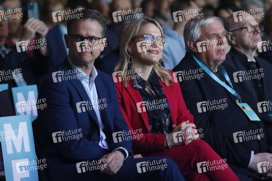 Carsten Linnemann, Christina Stumpp und Karl-Josef Laumann bei einer Wahlkampfveranstaltung der CDU zur Bundestagswahl 2025 in der Rudolf-Weber-Arena. Oberhausen, 21.02.2025