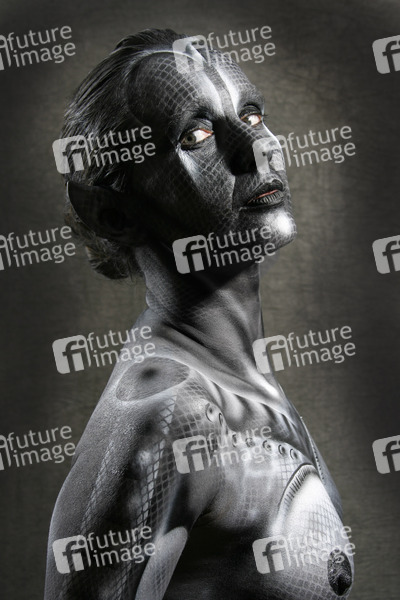 Bodypainting, Erotik, Frau, nackt, drinnen, weiblich, Monster, Außerirdische, Alien, Echse, Körperkunst, Kunst, Malerei, monochrom, erotic, woman, nude, indoor, female, monochrome, lizard, body art, body painting