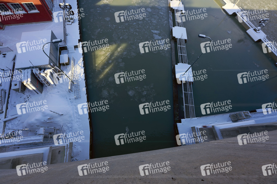 Schleuse Anderten, Wetter, verschneit, Schnee, Glätte, Eis, kalt, Wintereinbruch, Eisregen, Minustemperaturen, Winter, Winterwetter, Grenzwetterlage, Schneefälle, Schneefall, Frost, Wetterlage, Schiffahrt, Binnenschleuse, Kanal