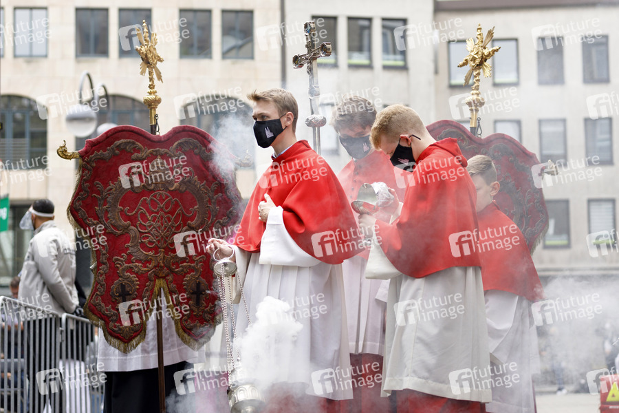 Religion, Glaube, Prozession, Messe, Gott, Gottesfurcht, Katholizismus, katholisch, Christen, Christentum, Kölner Dom, Prozession, Fronleichnam, Fronleichnamsprozession, Umzug, Weihrauch, Erzbistum Köln, Erzbischof, Hochfest, Gottesdienst, Messe, Pontifikalamt, katholische Kirche, bleibende Gegenwart Jesu Christi im Sakrament der Eucharistie, Fronleichnamsgottesdienst, Maskenpflicht, Kirche, Kirche in Zeiten von Corona, Jesus, Christus, Coronavirus, Coronakrise
