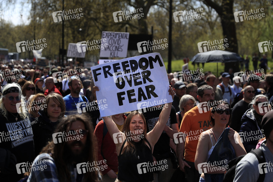 Mehrere tausend Menschen protestieren gegen die Corona-Maßnahmen und ziehen trotz geltender Beschränkungen für Massenversammlungen durch die britische Hauptstadt. Masken trägt dabei so gut wie niemand, dafür aber Protestschilder mit Aufschriften, die sich unter anderem gegen Corona-Pässe und -Tests richteten. London, 24.04.2021