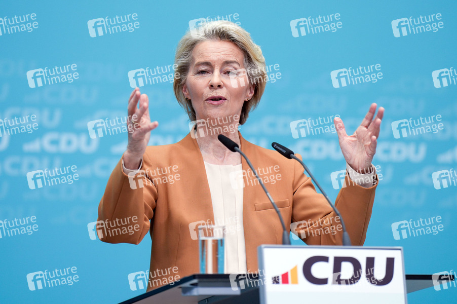 Ursula von der Leyen bei einer Pressekonferenz nach der Bundesvorstandssitzung der CDU mit der Bekanntgabe der Nominierung von Ursula von der Leyen als Spitzenkandidatin für die Europawahl im Konrad-Adenauer-Haus. Berlin, 19.02.2024