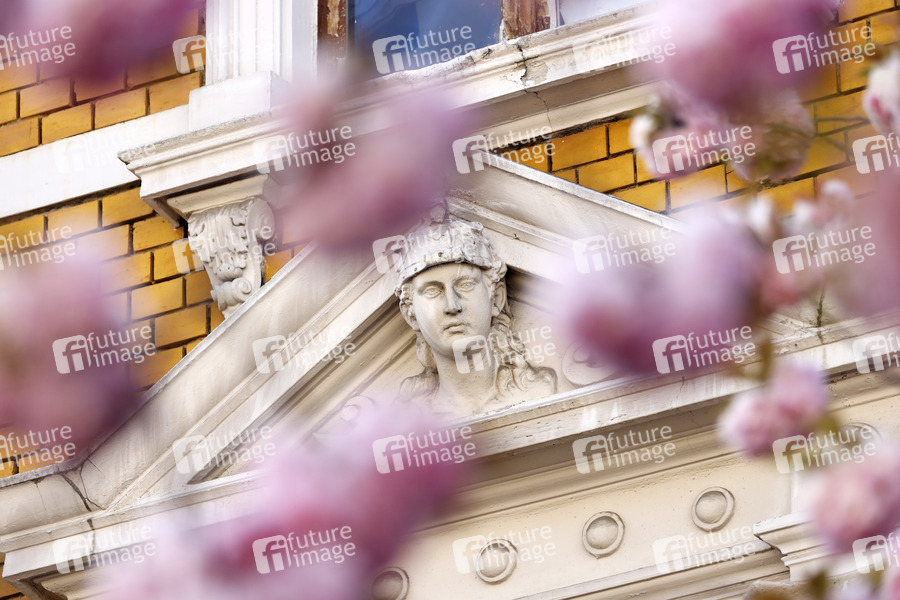 Passanten, Anwohner und Touristen bewundern die alljährliche Bonner Kirschblüte in der Bonner Altstadt rund um die Heerstraße. In diesem Jahr darf das Naturschauspiel nur unter Einhaltung strenger Corona-Maßnahmen beobachtet werden. Ordnungsamt und Polizei kontrollieren die Einhaltung von Maskenpflicht und Mindestabstand in den Gassen. Wenn der Andrang zu groß wird, sollen einzelne Straßen auch gesperrt werden. Bonn, 22.04.2021
