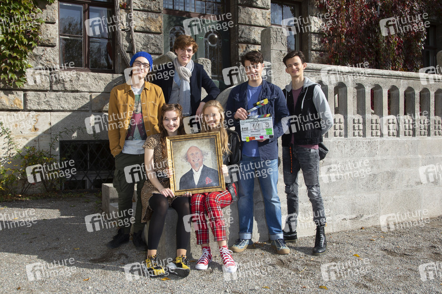 Maximilian Ehrenreich, Lorna zu Solms, Georg Sulzer, Lina Hüesker, Oskar Keymer und Eloi Christ beim Fototermin am Set des Kinofilms 'Hilfe, ich hab meine Freunde geschrumpft' im Schloss Faber-Castell. Stein, 18.10.2019