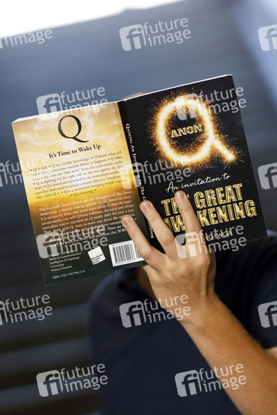Jemand verdeckt seinen Kopf mit dem Amazon-Bestseller 'Qanon - An Invitation to the Great Awakening'. Köln, 05.07.2020