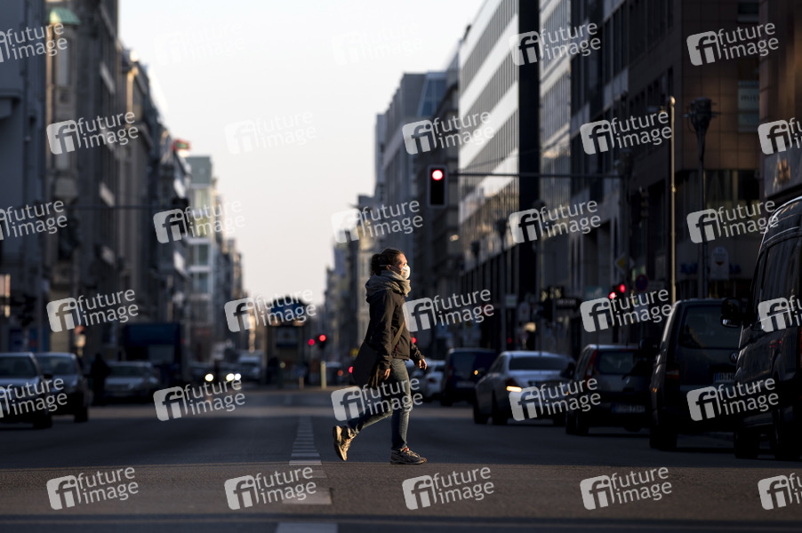 Fußgängerin mit Mundschutz während der Coronakrise. Berlin,. 25.03.2020