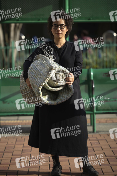 Mona Chen bei einem Photoshooting im Stadtteil Chai Wan. Sie ist eine international anerkannte Künstlerin aus Hongkong, die mit ihrer charakteristischen Technik des Verstrickens von geschredderten Texten Verbindungen über Grenzen hinweg herstellt und weggeworfene Materialien in tragbare Skulpturen verwandelt. Ihre Arbeiten kombinieren Elemente aus Mode, Performance und Skulptur. Hongkong, 13.02.2024