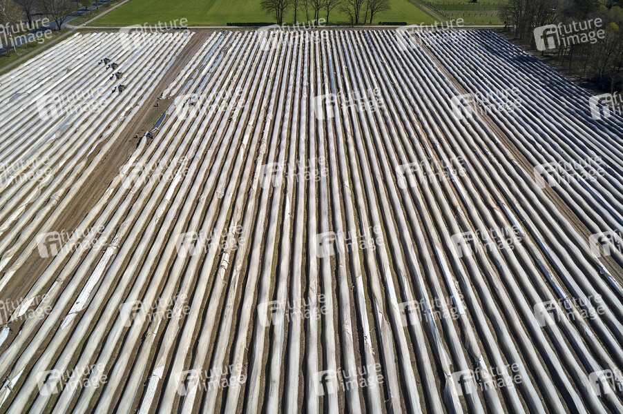 Spargelfeld, Spargel, Spargelfelder, Spargelernte, Gemüse, Erntehelfer, Feld, Luftbild, Luftaufnahme, Engels SpargelSpinne, Spargel Spinne, Spargelmashine