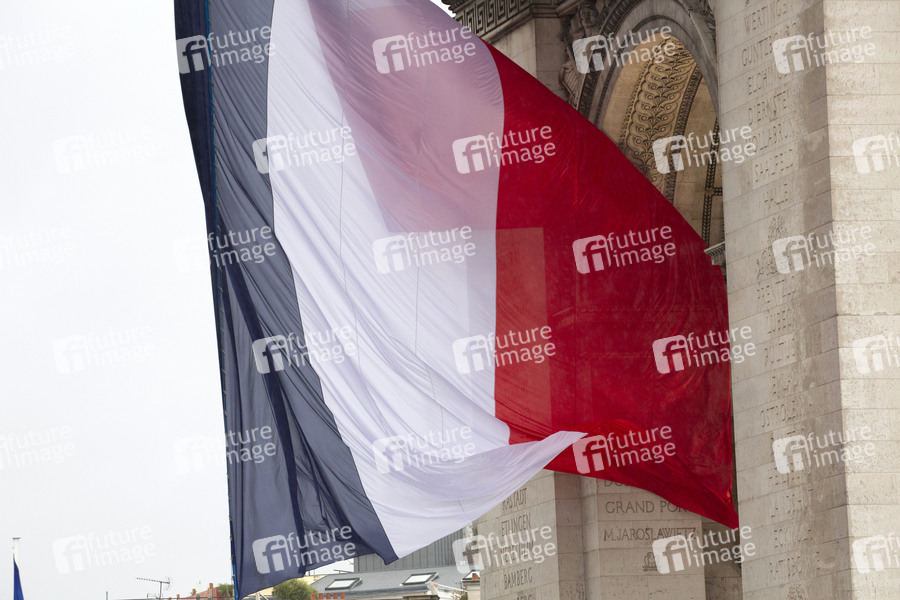 Französische Staatsflagge bei der 101. Jahrfeier des Waffenstillstands von 1918 am Triumphbogen. Paris, 11.11.2019