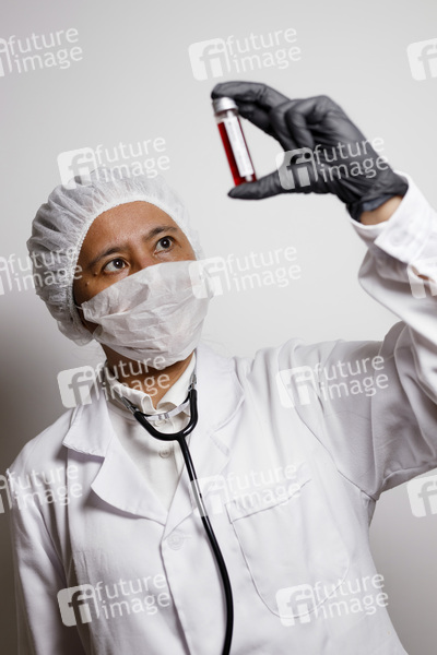 Eine Virologin posiert mit einer Corona-Blutprobe (Symbolfoto mit Model)