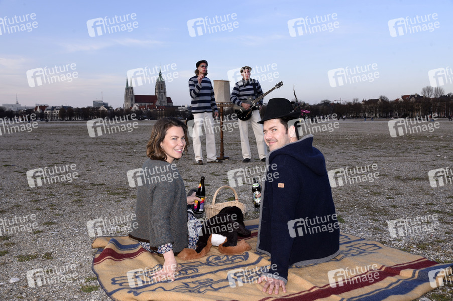 Christina Schmideder und Max Kronseder (DeSchoWieda) mit Guido und Günter von der Guten A-Band beim Videodreh zum Lied 'Radlg'fahrn und G'schmissn' der Guten A-Band im Bavariapark und auf der Theresienwiese. München, 26.03.2021
