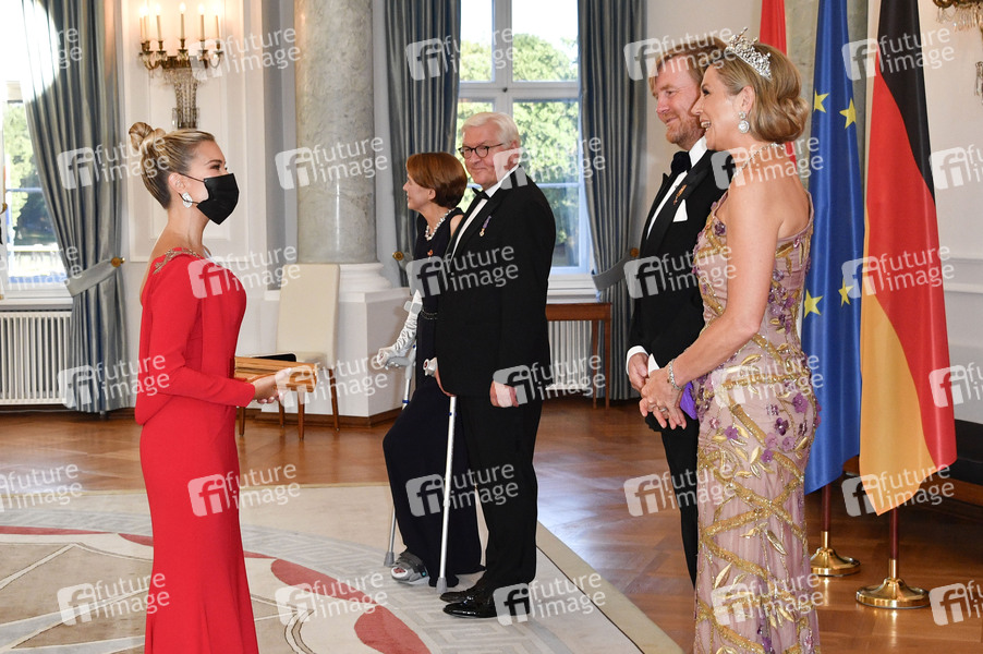 Sylvie Meis, Elke Büdenbender, Frank-Walter Steinmeier, König Willem-Alexander und Königin Maxima der Niederlande beim Defilee zum Staatsbankett zu Ehren von König Willem-Alexander der Niederlande und Königin Maxima, gegeben vom Bundespräsidenten und Elke Büdenbender im Schloss Bellevue. Berlin, 05.07.2021