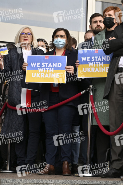 EU-Parlamentarier und Hunderte von Menschen demonstrieren vor dem Europäischen Parlament, um ihre Unterstützung für das ukrainische Volk zu zeigen, darunter Dutzende von in Belgien lebenden Ukrainern. Die Präsidentin des Europäischen Parlaments, Roberta Metsola, hält in Begleitung von Abgeordneten eine Rede vor den Anwesenden, in der sie die Unterstützung der Europäischen Union für die Ukraine deutlich macht und den Antrag der Ukraine auf EU-Mitgliedschaft begrüßt. Brüssel, 01.03.2022