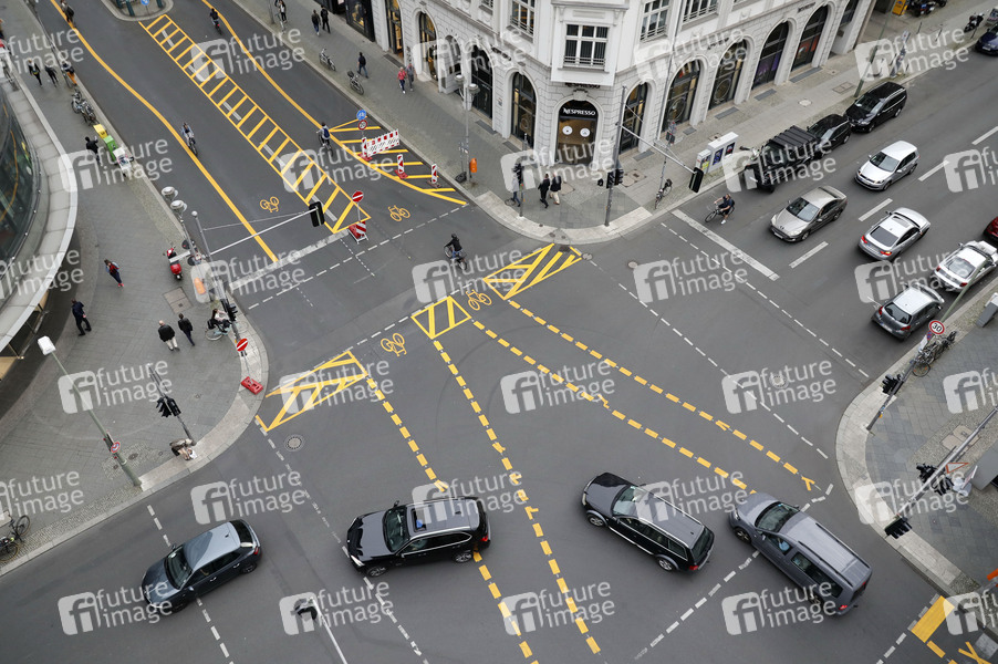 Bis Januar 2021 dürfen zwischen Französischer Straße und Leipziger Straße keine Autos auf der Friedrichstraße fahren - aber Radfahrer. Sie bekommen eine vier Meter breite Spur, die noch grün unterlegt werden soll, sie soll auch als Gasse für Rettungswagen dienen. Es gilt das Tempolimit 20 für Radfahrer. Das Projekt ist Teil des mehrmonatigen Tests 'Flaniermeile Friedrichstraße'. Berlin, 01.09.2020