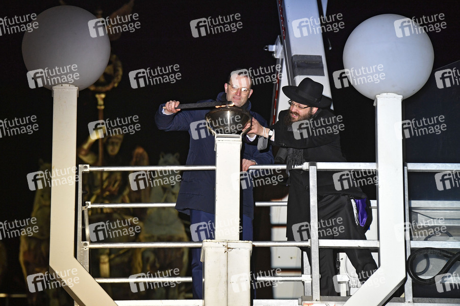 Jens Spahn und Rabbiner Yehuda Teichtal beim Zünden der ersten Kerze am Chanukka-Leuchter anlässlich der beginnenden Chanukka-Feiertage am Brandenburger Tor. Berlin, 10.12.2020
