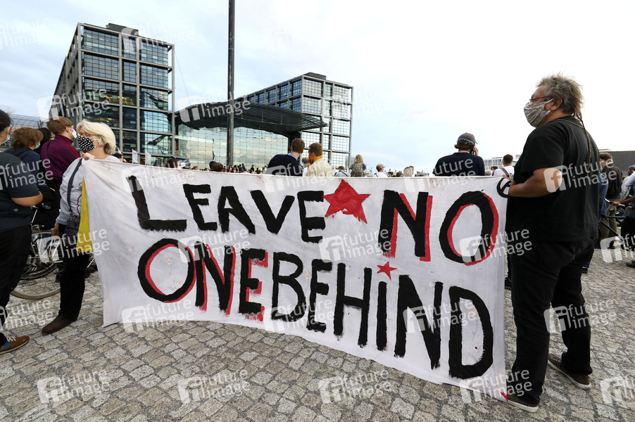 Tausende Demonstranten fordern die sofortige Aufnahme von Flüchtlingen aus dem von einem Grossbrand zerstörten griechischen Flüchtlingslager Moria (Lesbos) bei einer Demonstration unter dem Motto 'Evakuiert die Lager, denn #WirHabenPlatz' vom Bündnis 'Seebrücke' am Hauptbahnhof. Berlin, 09.09.2020
