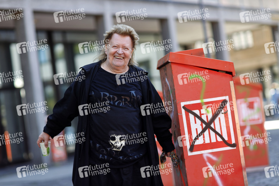HA Schult bei der Präsentation seiner Installation 'Tableau des Vergessens' aus alten Bild-Verkaufskästen auf dem Börsenplatz. Köln, 10.09.2020