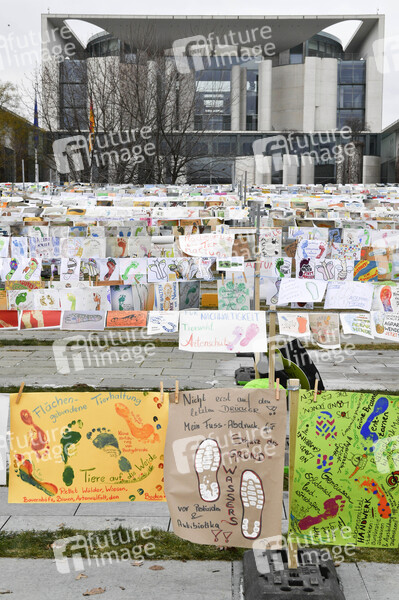 Landwirte, Klima- und Tierschützer demonstrieren unter dem Motto 'Wir haben es satt' für eine Wende in der Agrarpolitik. Vor dem Kanzleramt wird symbolisch mit rund zehntausend Fußabdrücken auf Papier eine bäuerliche, ökologische und klimafreundliche Landwirtschaft gefordert. Berlin, 16.01.2021