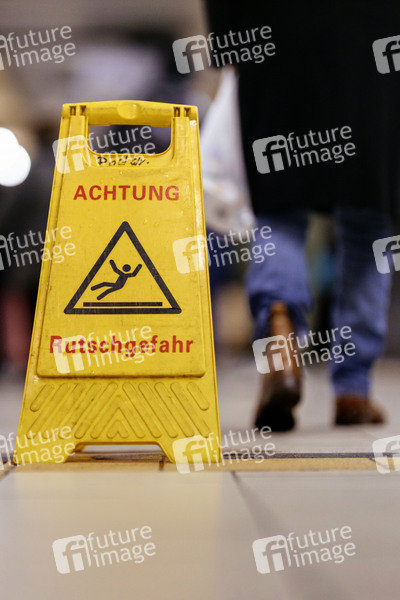 Warnung, Warnschild, Rutschgefahr, Ausrutschen, Nässe, Glätte, nass, glatt, Pfütze, Wasser, frisch gewischt, feucht, Feuchtigkeit, Unfall, Unfallgefahr, Haftung, Haftpflicht, Geschädgiter, Entschädigung, Ansprüche, Verkehrssicherung, Publikumsverkehr, Verkehrssicherungspflicht, Rutschen, Hinweisschild, Vorsicht, Sicherheit, Sturz, Sturzgefahr, Laufwege, Fußboden, Unachtsamkeit, unachtsam, Verkehrssicherungspflichtverletzung, Organisationsverschulden, Klappschild, Warnhinweis, Schaden, Schadenseintritt, Warnaufsteller, Reinigung, Reinigungsarbeiten, Regennässe, Schneematsch, Stolpergefahr, Aufsteller, Klappaufsteller, Symbolbild, Symbolfoto