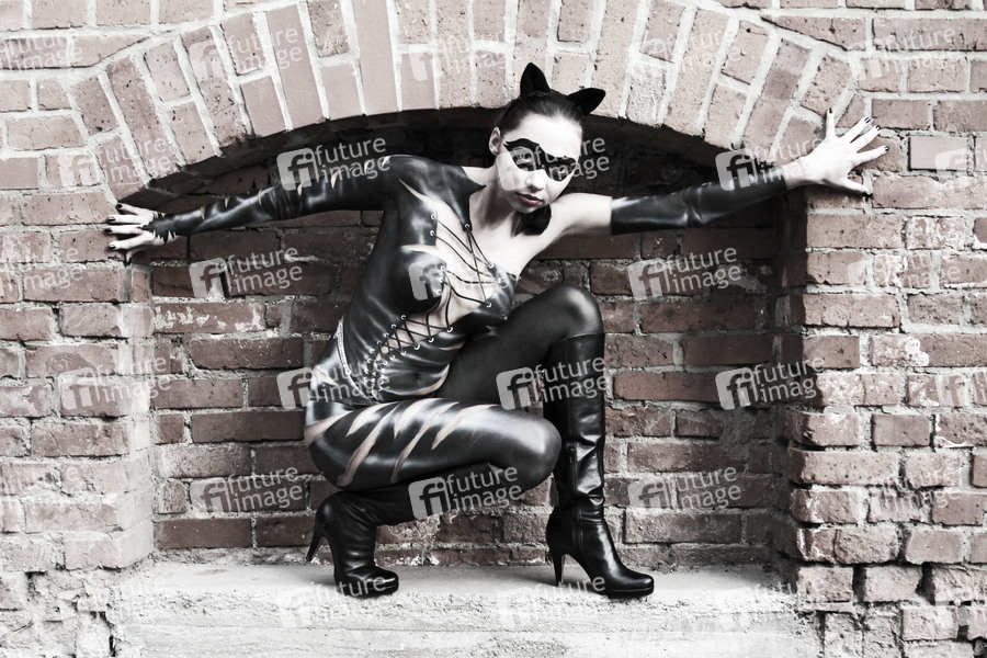 Catwoman Photoshooting mit SOLsnap-Model Elena im Hefehof-Center, Hameln. Bodypaint-Künstler: Jörg Düsterwald