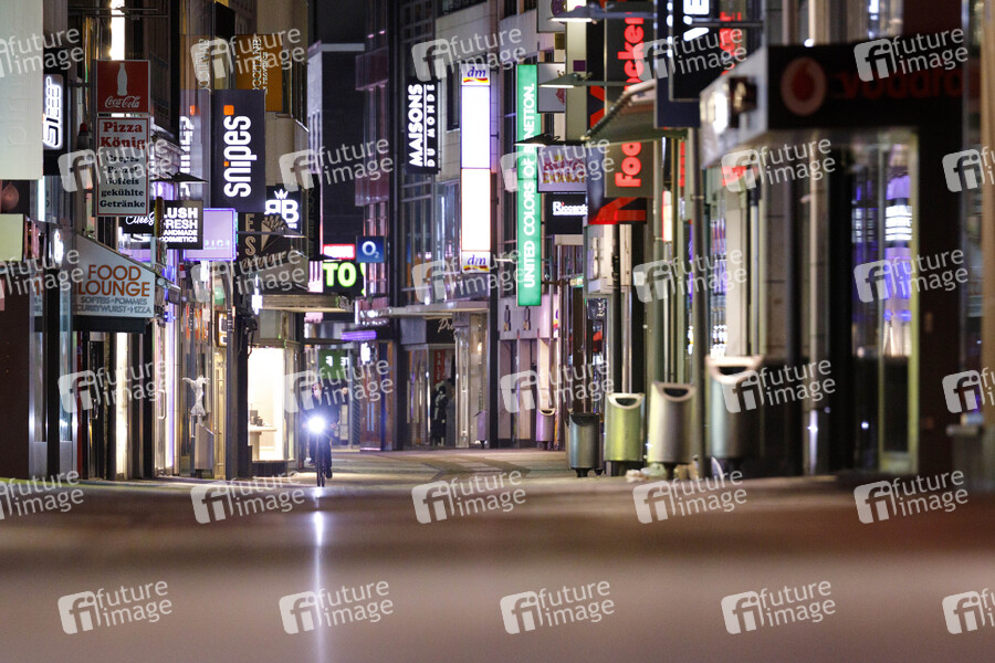 In Köln gelten seit dem 17.04.2021 um 0 Uhr Ausgangsbeschränkungen. Das Verlassen der Wohnung ist dann in der Zeit von 21 Uhr bis 5 Uhr fast ausnahmslos verboten. Die Beschränkungen beschloss der Krisenstab der Stadt Köln am Freitag. Ordnungsamt und Polizei kontrollieren die nächtlichen Straßen wie die Einkaufsstraße Hohe Straße im Bild. (Themenbild, Symbolbild) Köln, 17.04.2021