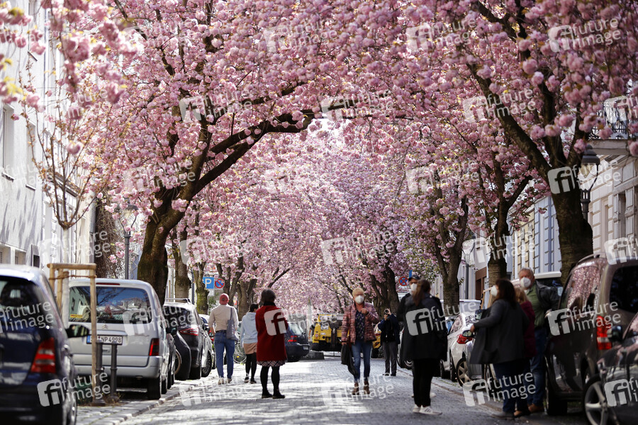 Passanten, Anwohner und Touristen bewundern die alljährliche Bonner Kirschblüte in der Bonner Altstadt rund um die Heerstraße. In diesem Jahr darf das Naturschauspiel nur unter Einhaltung strenger Corona-Maßnahmen beobachtet werden. Ordnungsamt und Polizei kontrollieren die Einhaltung von Maskenpflicht und Mindestabstand in den Gassen. Wenn der Andrang zu groß wird, sollen einzelne Straßen auch gesperrt werden. Bonn, 22.04.2021