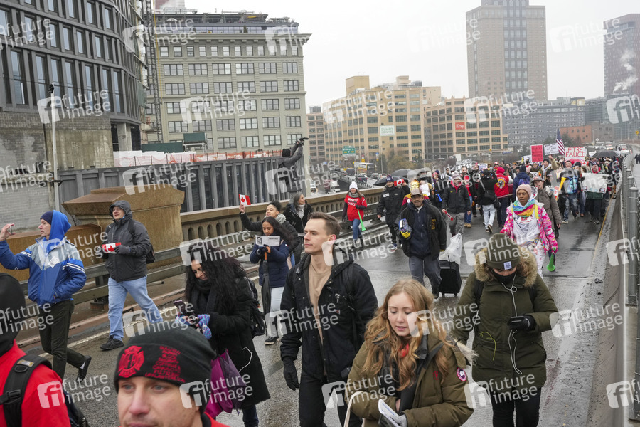 Über 300 Stadtarbeiter und andere protestieren mit einem Marsch über die Brooklyn Bridge, gegen die Ankündigung der Stadt, dass kommunale Angestellte ohne Covid-19-Impfung bis zum Ende der Woche entlassen würden. New York, 07.02.2022